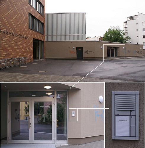 Der Zugang zur Sporthalle liegt im verkehrsberuhigten Teil der Lindenaststraße.