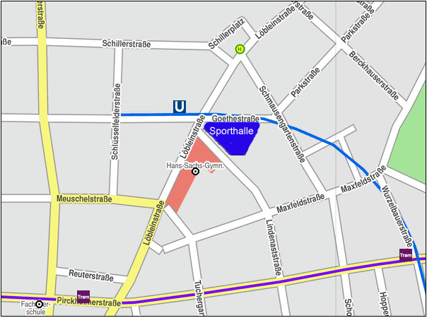 Anfahrt mit U3 bis Maxfeld oder mit Privatfahrzeug über Pirckheimerstraße/Maxfeldstraße/Löbleinstraße oder Nordring/Löbleinstraße. Mit Parkplätzen schaut's aber meistens schlecht aus, manchmal findet man einen in der Goethestraße hinter der Halle oder auch in der Lindenaststraße. Die U-Bahn ist allemal die bessere Alternative.